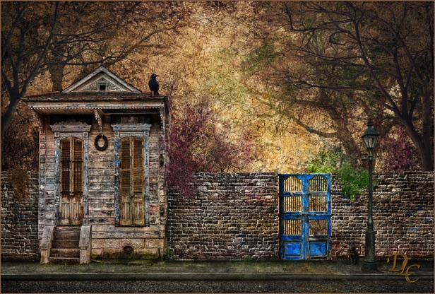 Everyone should have a place to go to -- to really get away. This is my imaginary place - through the blue gate. This composite photograph is a combination of my favorite places. the structure, the street light and the mossy sidewalk are from New Orleans, the gate from Canyon Road in Santa Fe, the wall is from Dallas, and the background is from Corrales. This image is also unusual in that it looks best in a small size - especially framed at 8 x 12 inches, due to the ornate elements.