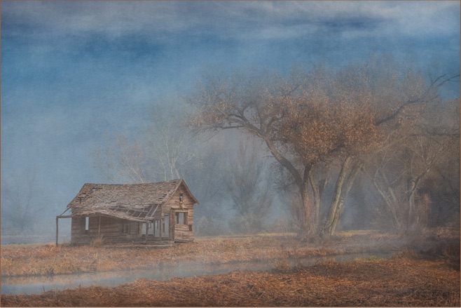 The background from this scene is a foggy morning from the Bosque del Apache, in 2017. The cabin and other changes were made by me in 2020 to create the scene that I envisioned, a nostalgic trip back in time. The appearance of this image on infused aluminum is as dramatic as it is painterly on canvas.