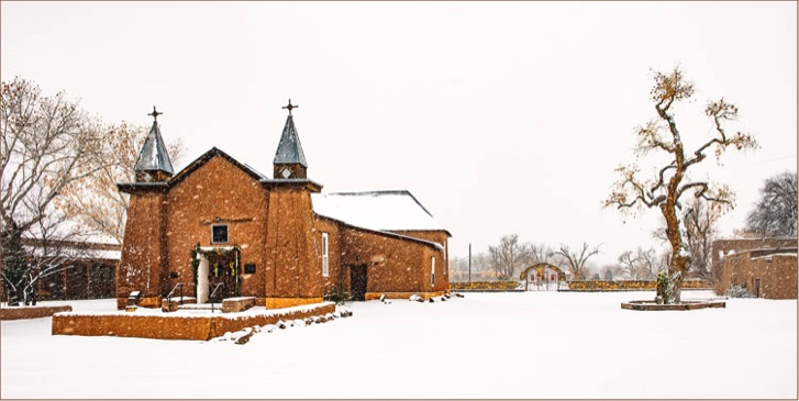 First thing in the morning, January 1, 2019, I rushed out to try to get to Corrales' "Old Church" before there were footprints in the snow. Large flurries were still coming down so took a lot of shots through the open window of my vehicle. The snow was coming down so heavily that it was actually difficult to see the church so I went home (a couple of miles away) and watched the weather. The snow subsided and I ultimately came back at 1:37 in the afternoon to take this shot. The composition is a little unorthodox which bothers some people, but others really like it. The historic Casa San Ysidro Museum is in the background at the far right. This photograph, because of the lighting and the painterly look, looks best on canvas.